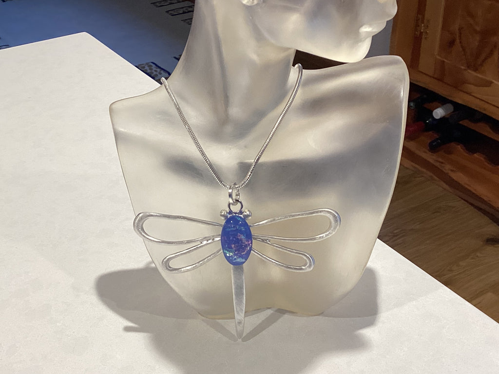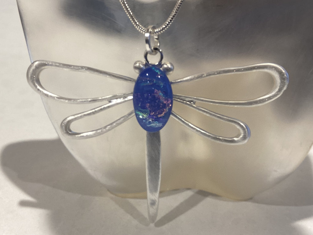 Beautifully handcrafted dichroic glass using multiple complex techniques to achieve brilliant colours. This is a large dragonfly on a long chain. 32” 3mm snake chain provided. Other sizes in 2mm can be provided from 18”-24”.