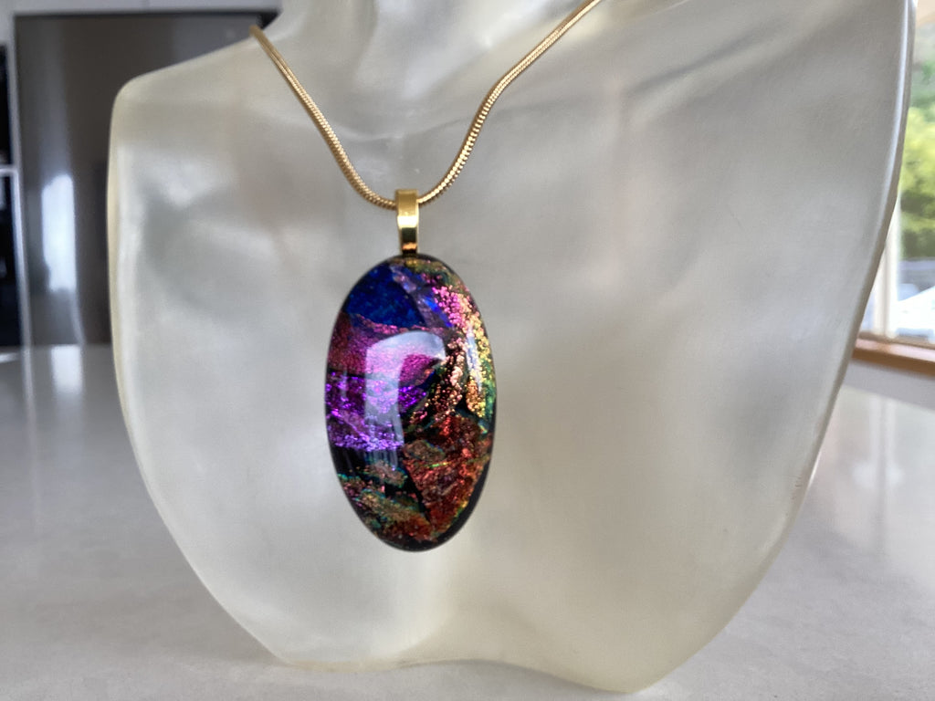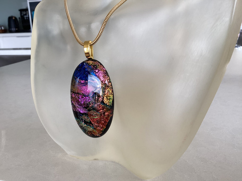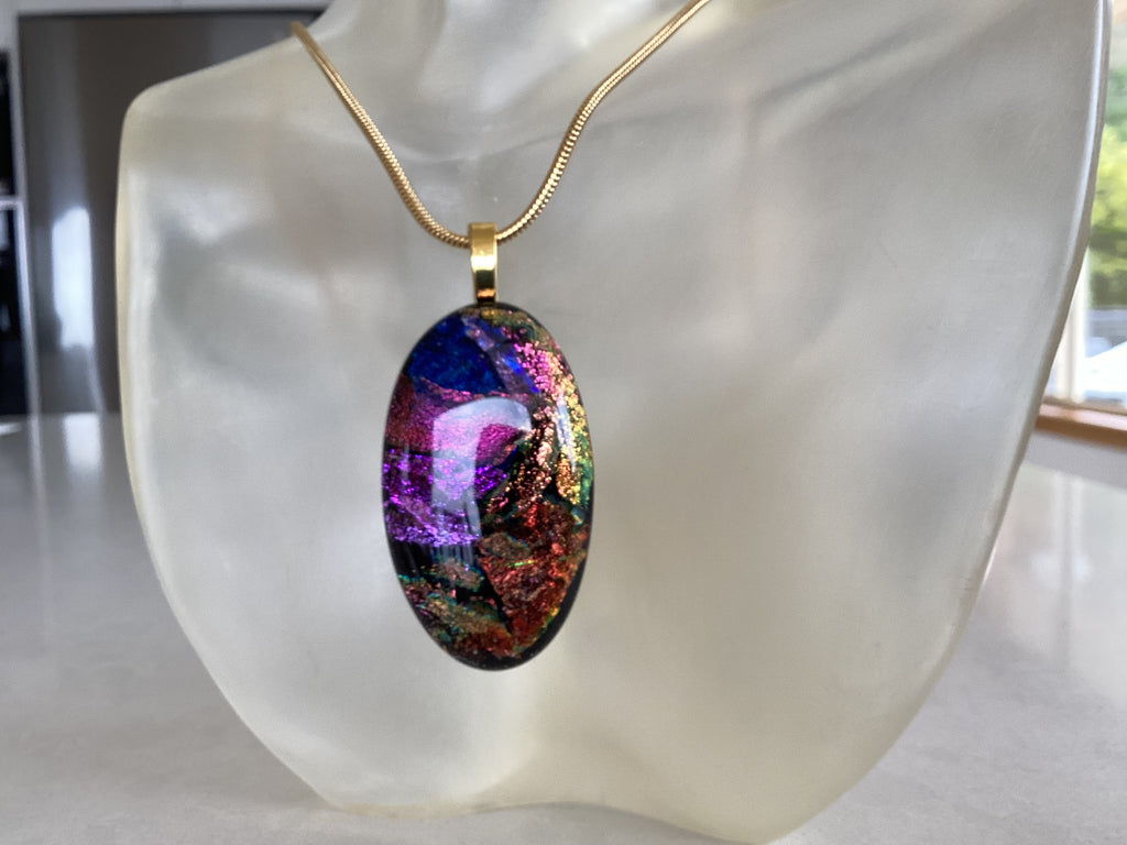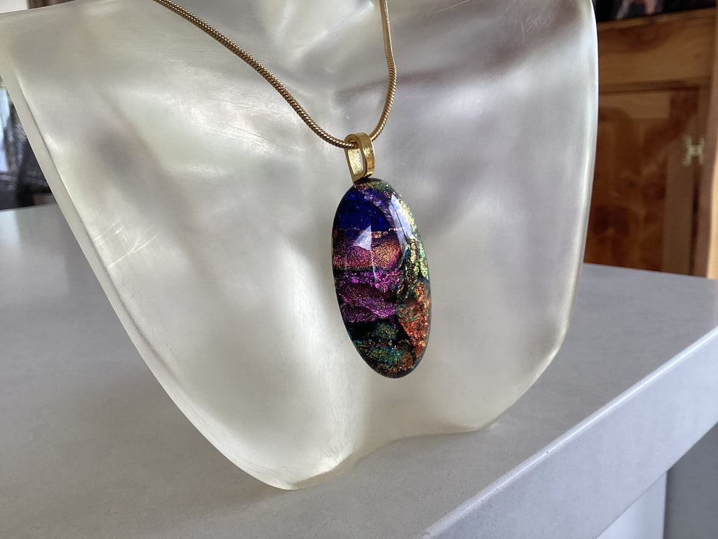 Beautifully handcrafted dichroic glass using multiple complex techniques to achieve brilliant colours. 18" 2mm snake chain provided.